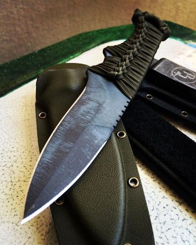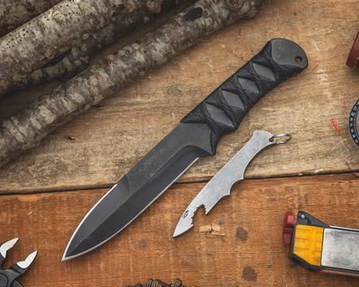 The BattleShark™ (like the Bloodshark™) is made of 154CM steel and can be made with the same thickness and same grind, or it can be made out of 3/16" stock with a full bell grind and a sharpened swage.
